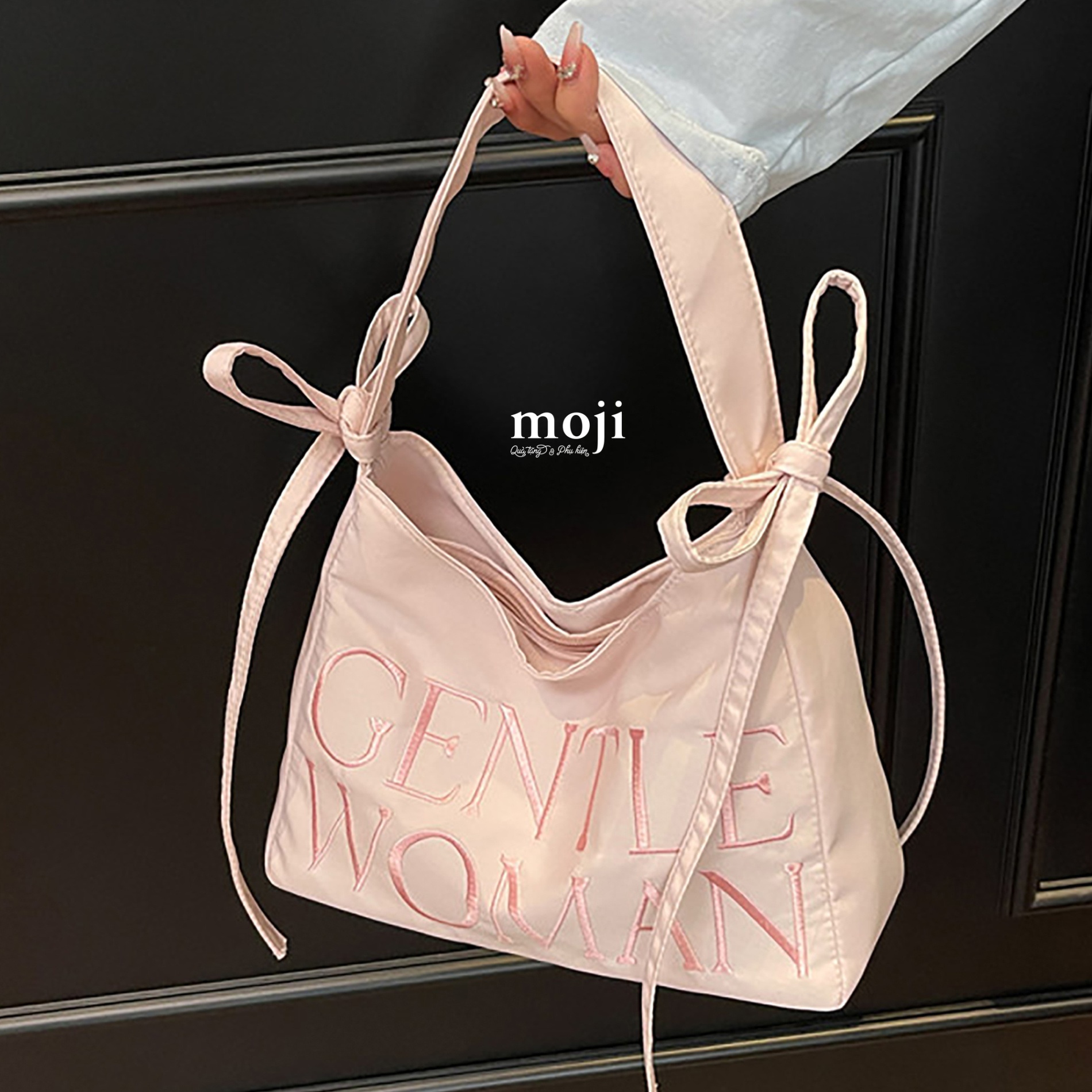 🖋️ Điểm nhấn nổi bật với dòng chữ Gentle Woman dập nổi cùng quai bản lớn phối nơ hai bên duyên dáng.